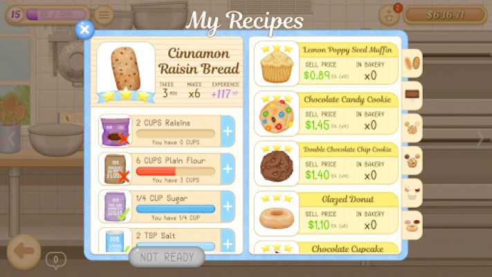 Each recipe calls for a specified quantity of different real-life baking ingredients you’ll be able to stock and bake with! As you level up you’ll be able to purchase ingredients in higher quantities, or bulk, to keep up with your baking demand.