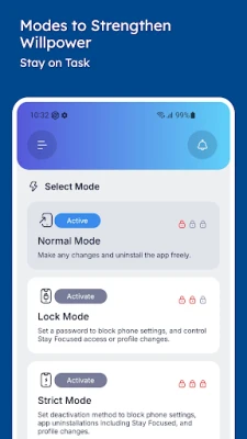 🔒 Strict Mode: Prevent bypassing restrictions to maintain focus with the app blocker.