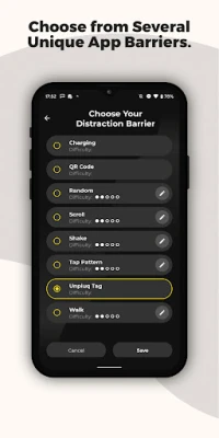 - All Barriers: Use all the available barrier options, including the patented Unpluq Tag, the keyfob that keeps you focused, as well as Walking (Steps), Scrolling, Charging, Random, or QR code barriers.